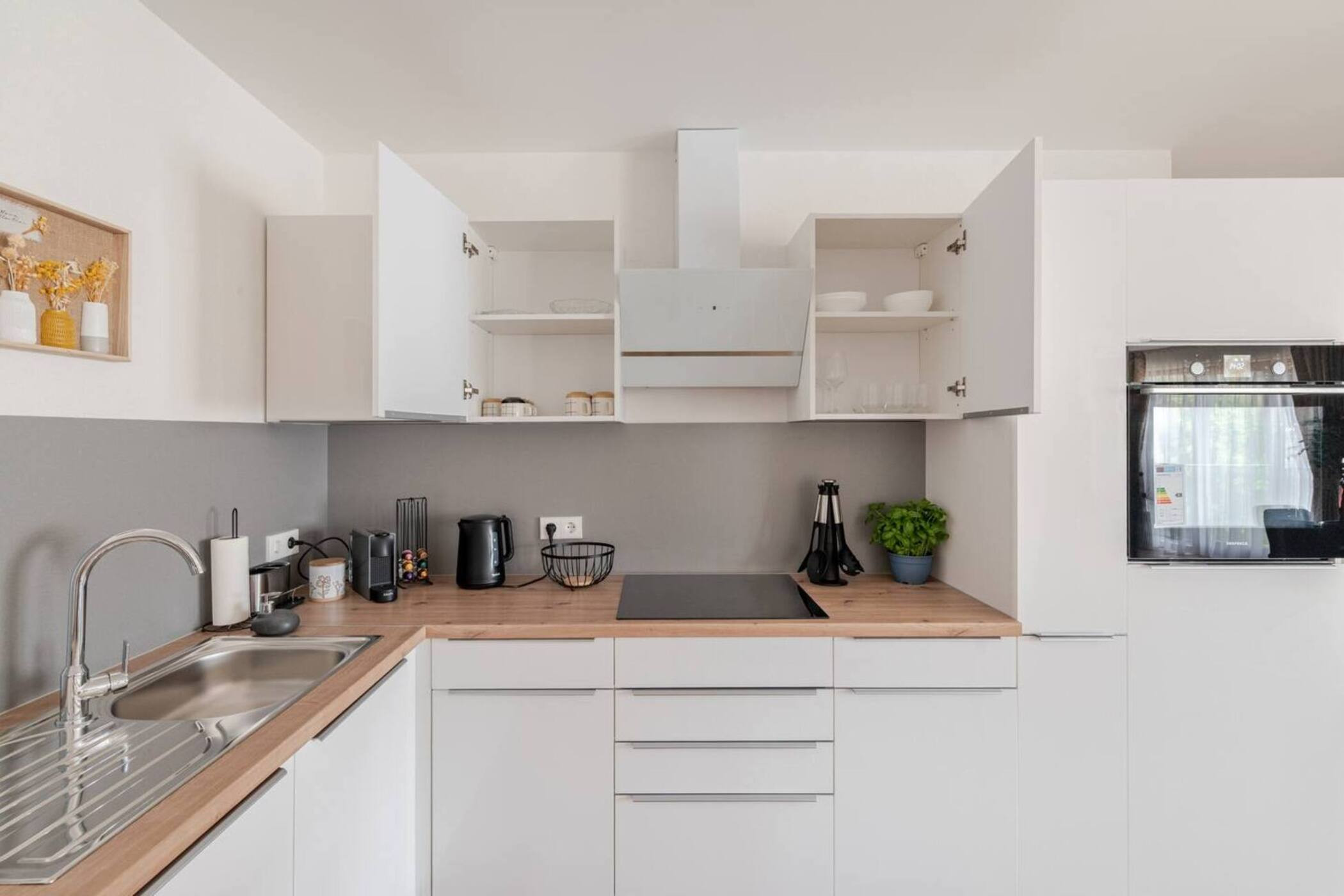 Fully equipped with modern appliances, including a stove, oven, dishwasher, and coffee machine.